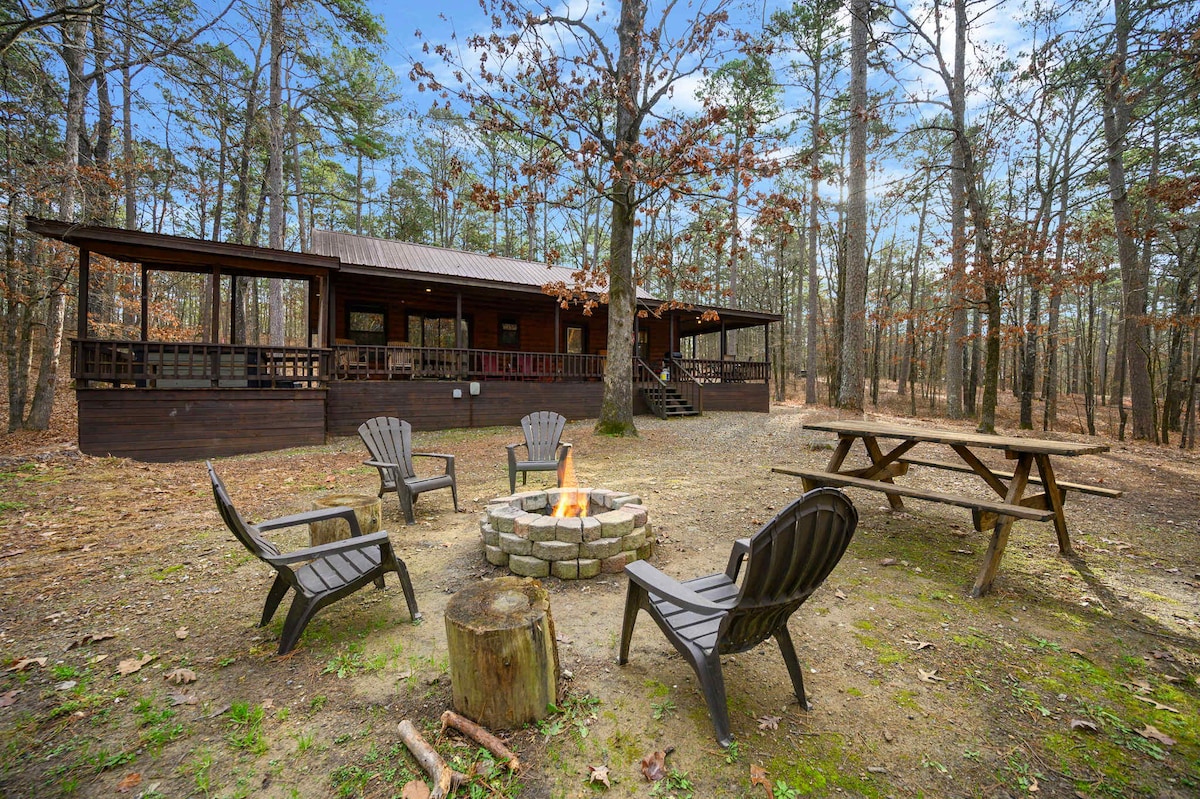 Velkommen til "Timberline Pines", hvor romslig komfort møter den naturlige skjønnheten til Broken Bow. Dette innbydende feriestedet er designet for avslapning, tilkobling og hukommelse i hjertet av furutrærne. Perfekt for familier, par eller små grupper, det er ferien du har ventet på. ✔ Hundevennlig ✔ Dekket boblebad ✔ 1 soverom med king-size-seng ✔ Ett soverom med queensize-seng ✔ To komplette bad. Peiser ✔ inne og ute ✔ Branngrop med Adirondack-stoler ✔ Cornhole ✔ Fullt utstyrt kjøkken ✔ Plass til seks gjester.
