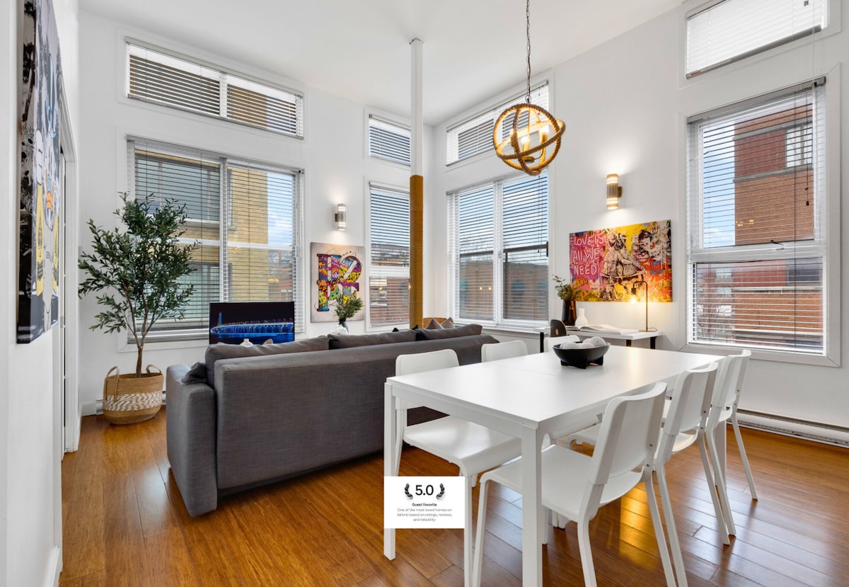 Bo i en romslig to-romssuite i sentrum av Montréal, bare noen skritt fra Sainte-Catherine Åpen planløsning med høyt tak og en koselig stue – perfekt for familier, grupper og lengre opphold. Moderne, kjæledyrvennlig sted med nøye utvalgt innredning, smart-TV, raskt trådløst nettverk og førsteklasses bekvemmeligheter. Pokerbrett og sjetonger er inkludert for spillkvelder.