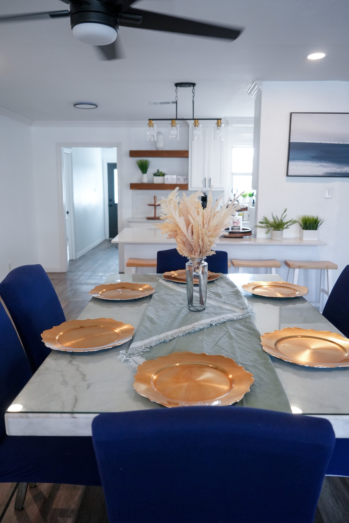 Velkommen til det trendy 1930-talls hjemmet ditt, bare noen kvartaler fra den historiske sentrumsbyen McKinney. Utforsk boutiquebutikker, kokkeide restauranter og lokale kaffebarer. Innvendig møter høye tak, originale detaljer og kuraterte møbler moderne oppdateringer. Det fullt utstyrte kjøkkenet gjør måltidene enkle, og verandaen er perfekt for morgenkaffe eller kveldsvin. Den åpne stuen er ideell for sammenkomster. Tre soverom sikrer avslappende opphold, og kombinerer karakter med komfort for det perfekte hjemmet borte fra hjemmet.
