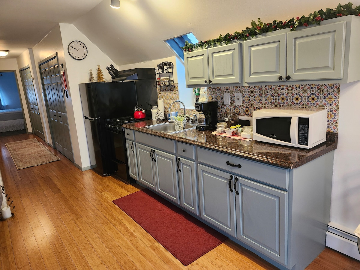 Lys og ren leilighet med én soverom og egen inngang i en rolig gate. Kjøleskap, mikrobølgeovn, Keurig inkl. To miles til restauranter, barer, bryggerier og shopping i sentrum. 10 miles til vingård og vinmarker. 3 miles til strender. 3 miles til Fire Island Ferry. 30 miles til NYC. 3 miles til Baseball Heaven. 10 miles til Stonybrook University & hospital. 1 engelsk mil til offentlig hestegård og stall. 3 miles til St Joseph's College. 0,5 miles til Long Island Community Hospital. 1 engelsk mil til turmuligheter. 45 minutter til JFK. 10 minutter til McArthur flyplass.