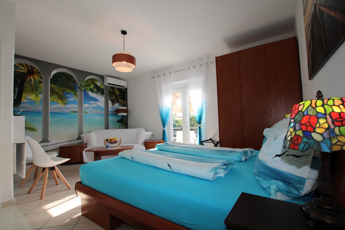 Blue Adria Suites er private studioleiligheter som alle er ideelle for 2 personer. Studio-leiligheter inneholder eget dusj / toalett, dobbeltseng, minikjøkken med kjøleskap, vask, 2 elektriske kokeplater og filterkaffemaskin, og en sofa. Hvert studio har en balkong med en parasoll og en sittegruppe for to personer, med utsikt over hagen eller en rolig gate. Studio-leilighetene har klimaanlegg, og gjestene har tilgang til trådløst nettverk. Det tilbys parkering foran huset eller langs gaten.