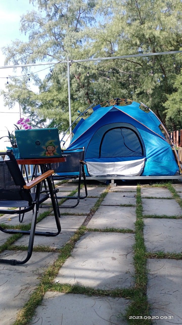 Campingstemning – byens skyline! Det romslige lerrets-teltet (2 × 3 m) ligger på taket av NU-bygningen (137/34 Tran Dinh Xu, District 1) og tilbyr en urban glampingopplevelse: sove under lysene i byen, men likevel nok svømmebasseng, treningsstudio og heis.