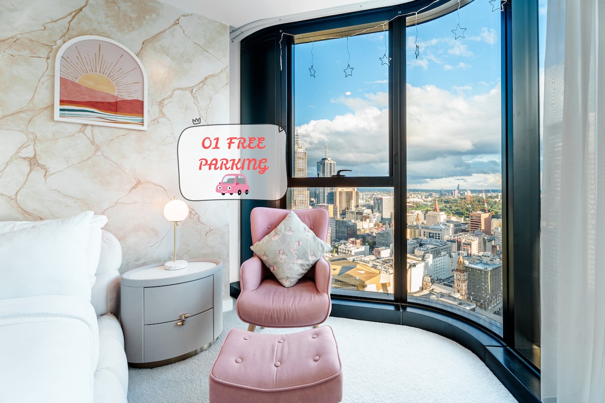 Bli ønsket velkommen i de svært sikre og en av de mest prestisjefylte boligbygningene i Melbourne - Prima Pearl. Kom til den skyhøye leiligheten på nivå 58 og beundre den vidstrakte utsikten gjennom vinduer fra gulv til tak. Nyt utsikten mens du slapper av på en romslig seksjonssofa og ligger i sengen. Tilbered måltider på et elegant kjøkken og fullfør klesvasken din med en fullt funksjonell vaskemaskin og separat tørketrommel. Bilparkering er tilgjengelig mot et nattgebyr på 20 $ per natt .