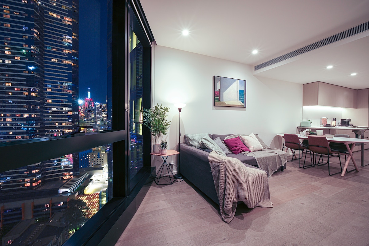 Opplev symbolet på luksusliv i denne fantastiske 65 kvm leiligheten, perfekt plassert i Paris-enden av Melbourne. Nyt en fantastisk utsikt over byen i ro og mak i din private bolig, komplett med en romslig stue med en skinnsjesalong og en skinnsofa med tre seter. Det moderne spisebordet har plass til to, perfekt for intime sammenkomster. Nyt en spasertur i marmordusj i lukking og bad med LED-sminkebelysning. Bassenget er oppvarmet året rundt og det beste i Melbourne.