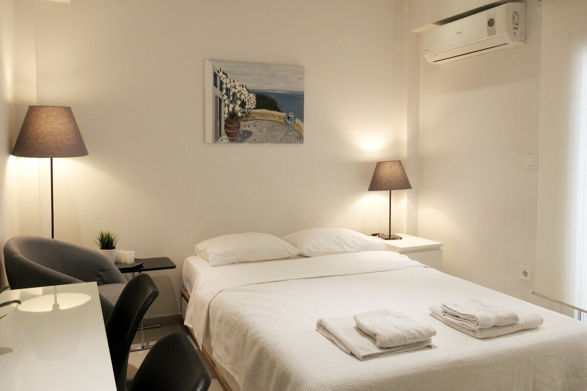 Unik 1 soverom fullt utstyrt leilighet i syvende etasje i en 2020 renovert bygning med en fantastisk terrasse balkong. Trådløst nettverk med høy hastighet, førsteklasses fasiliteter, en luksuriøs queensize-seng og din egen Netflix-konto er bare noen få ting vi tilbyr deg. Lysende, romslig, med alt du trenger for å nyte ditt opphold i hjertet av Thessalonikis sosiale liv, bare 5 minutter fra Aristoteles-torget og 2 minutter fra strandpromenaden. Velkommen og kos deg under oppholdet ditt!