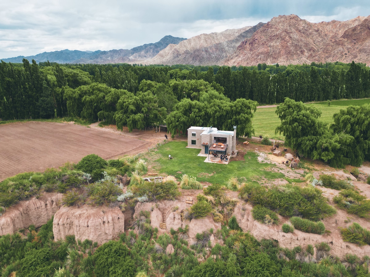 Moderne arkitekturhytte. Tre soverom. To komplette bad Stue, spisestue og kjøkken Sekundær bosatt i mesanin. Innendørs peis. Elektrisk og parafinoppvarming. Galleri og hage. Terrasse i øverste etasje med utsikt over fjellkjeden Los Andes. Fogoneroom og gjørmeovn i hagen. Trådløst nettverk. Fullt nedsenket i roen i dalen (ingen naboer i nærheten). Ti minutter til sentrum. 1,5 time fra Mendoza by og internasjonal flyplass.
