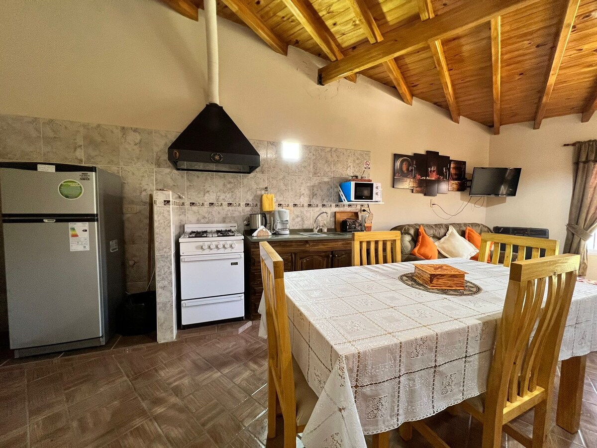 Slapp av i denne unike og rolige overnattingen. Det er en tilknyttet leilighet med egen inngang, overbygd garasje, komfortabelt rom, utstyrt kjøkken, spisestue og privat innvendig terrasse. Rommet har en king-seng med mulighet til å skille seg inn i to enkeltsenger. Den har en stor hage med quincho, churrasquera og felles basseng. Hele huset drives av solenergi. Det ligger i La Primavera, et landlig område 16 km fra byen Mendoza.