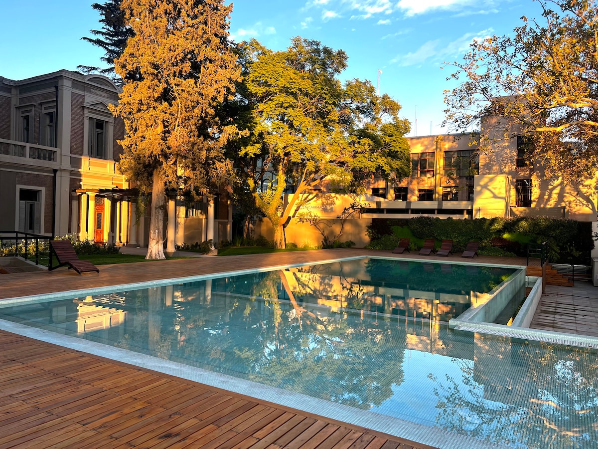 Ha et avslappende og hyggelig opphold i leiligheten vår i luksuriøse Torre Leloir, som ligger i Quinta Sección, et av de mest fredelige nabolagene i Mendoza. Ligger rett ved siden av den nye matdestinasjonen Mercado Moreno. Du vil nyte en vakker leilighet med en fantastisk utsikt over byen. Trådløst nettverk med hastighet på 500 Mbit/s for hjemmekontor. – Vaskemaskin i leiligheten. (Andre enheter i bygningen bruker en felles vaskemaskin.) – Badstue og jacuzzi. – Sikkerhet døgnet rundt. – treningsstudio – svømmebasseng