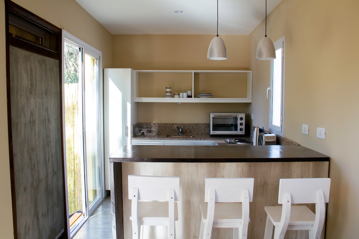 POSADA 1460 Du vil bo i en 40 fot maritim container, resirkulert til ny , som er delt inn i to områder , hvert område har uavhengig inngang, privatliv og deler den store hagen ( 1000 mts2) og bassenget. Du vil ha et enkeltrom som består av soverom , bad , bad, spisestue, kjøkkenkrok og terrasse på terrassen. Et kjæledyr i liten størrelse er tillatt. Den skal ikke overlappe med en annen vert samtidig. Rådføre.
