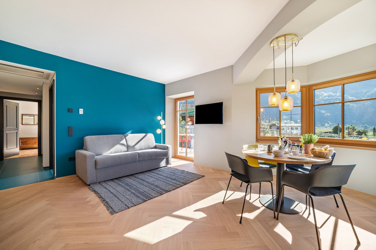 The apartment "Apt. Stefan – Schenna Chalet" is centrally located in the heart of Schenna and offers stunning views of the surrounding mountains. On a spacious, step-free 100 m², you will find a cozy living room, a fully equipped kitchen, two bedrooms, two bathrooms, and a guest WC – ideal for up to five people. Amenities include fast Wi-Fi, TV, air conditioning, hairdryer, towels, washing machine, iron, and dishwasher. A private sauna adds extra comfort.