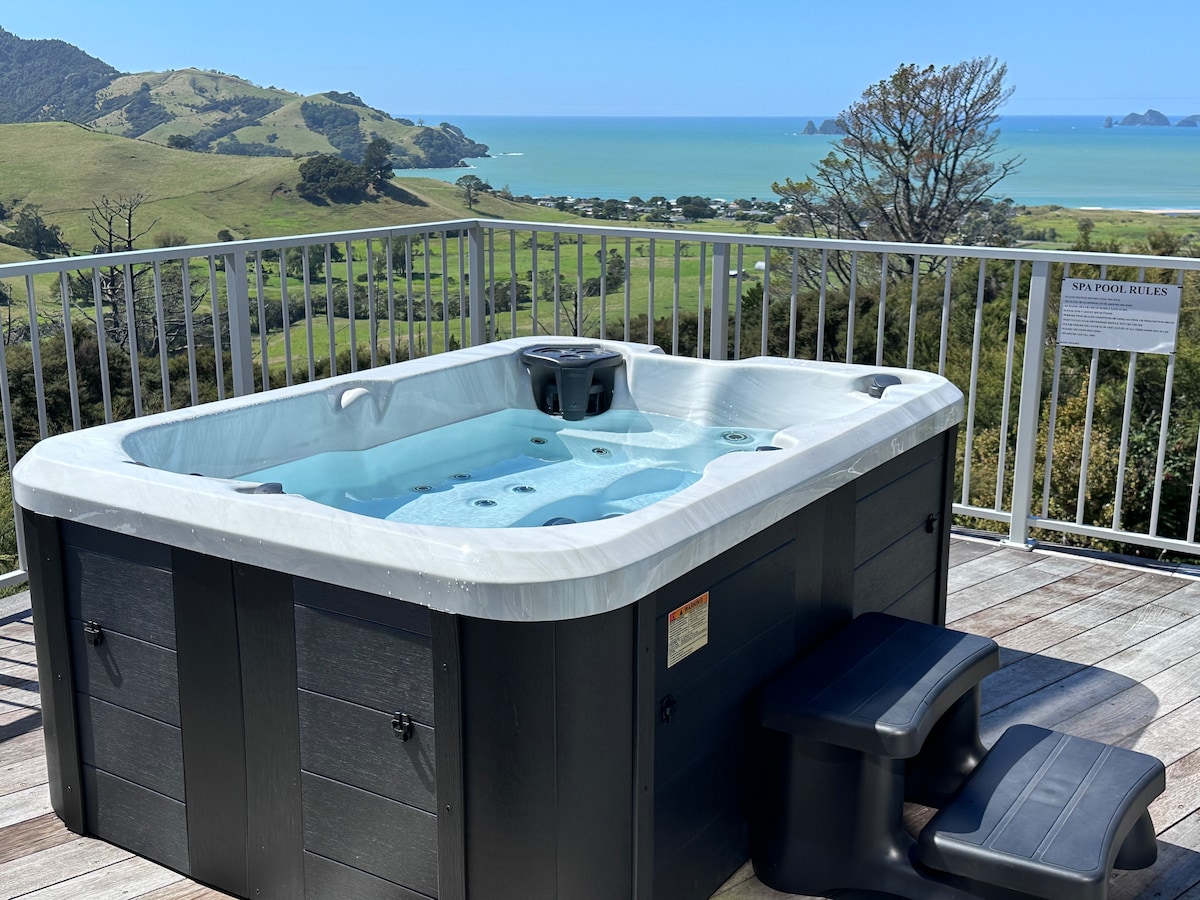 Den beste utsikten i New Zealand! Det superkomfortable, arkitektonisk utformede hjemmet vårt har 180 graders utsikt over Mercury Bay. Du har fullt privatliv og tilgang til ditt eget romslige rom, bad og privat balkong bare til ditt bruk. Vi tilbyr kaffe, te, melk, kjeks, frokostblanding og et minikjøleskap du kan bruke. Vær oppmerksom på at det ikke er tilgang til kjøkkenfasiliteter (men vi har fantastiske lokale restauranter vi kan anbefale!). Enkel parkering til Cathedral Cove på veien vår!