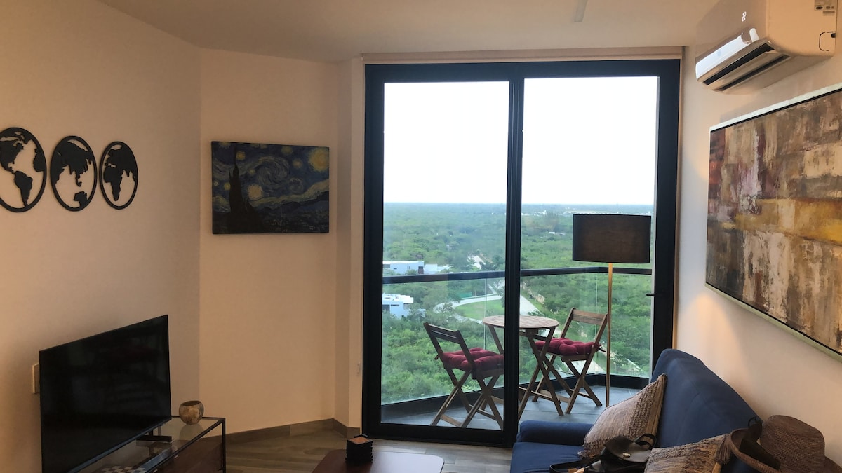 Loft til leie, som ligger i 17. etasje i Adamat Mérida, innredet for å nyte utsikten fra alle vinkler, enten det er fra spisestuen, stuen eller soverommet, inne i boligområdet Cabo Norte hvor du finner det viktigste kjøpesenteret i byen, Plaza La Isla, bare 2 minutters gange unna, i tillegg til innsjøer, turstier, svømmebasseng, treningsstudio, yogarom, spillrom, Sky Lounge, takhage og vaskeri