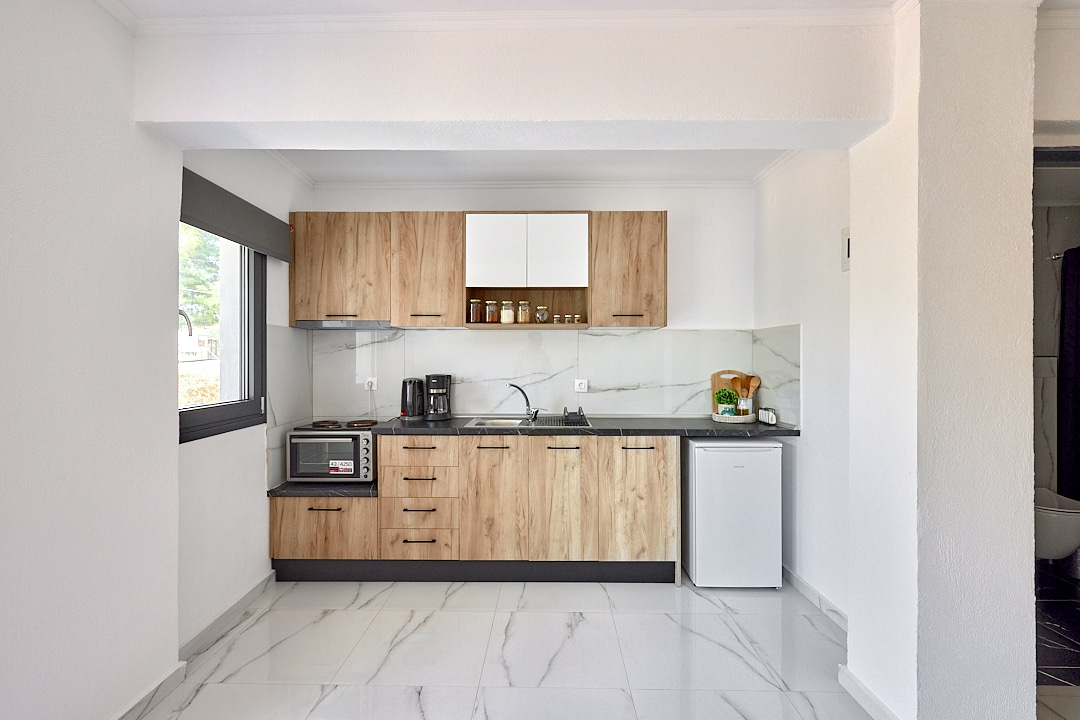 Oppdag Sithonia med et opphold i vårt komfortable studio, med plass til opptil fire gjester. Dette studioet ligger blant pittoreske furutrær og med umiddelbar tilgang til stranden, og sikrer et rolig miljø for ferien din. Den har et fullt funksjonelt kjøkken for å tilberede måltidene dine. Den felles terrassen tilbyr et innbydende sted hvor gjester fra begge studioene kan samles og få kontakt. Studioet vårt er ideelt for de som liker naturen og utforskning, og garanterer et hyggelig og hyggelig opphold.