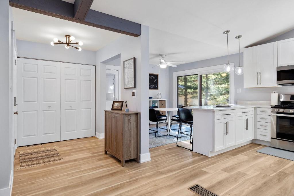 The Pines Cottage på Birchwood er en koselig hytte med to soverom og ett bad, med separat TV-rom, perfekt for et avslappende besøk i Michiana Shores, IN. Gå til de private strendene ved Stop 38 og Stop 41. Bakre terrasse og veranda foran for rolige morgener med kaffe eller kveldsdrikke. Ligger 0,7 miles (10 minutters gange) fra innsjøen og stranden ved Stop 38 og Stop 41, 6 minutters kjøring til New Buffalo og Michigan City – det er perfekt for en ferie til Harbor Country. Besøk lokale bryggerier, vingårder og mye mer.