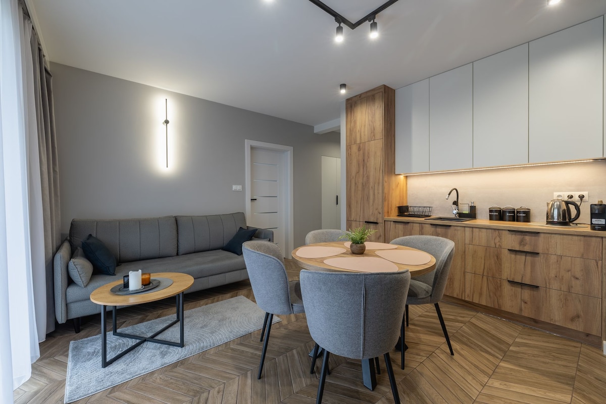 En moderne og komfortabel leilighet i ellevte etasje i en bygning som ligger på promenaden ved lagunen, i komplekset av bygninger Panorama Kwiatkowski i Rzeszów. Beliggenheten til leiligheten gir en unik mulighet til å komme i kontakt med naturen i nærheten av sentrum, ikke langt fra Rzeszów Boulevards. Når du hviler her, kan du bruke stranden, bryggen, strandpromenaden, sykkel- og turstier, lekeplasser samt butikker og restauranter.