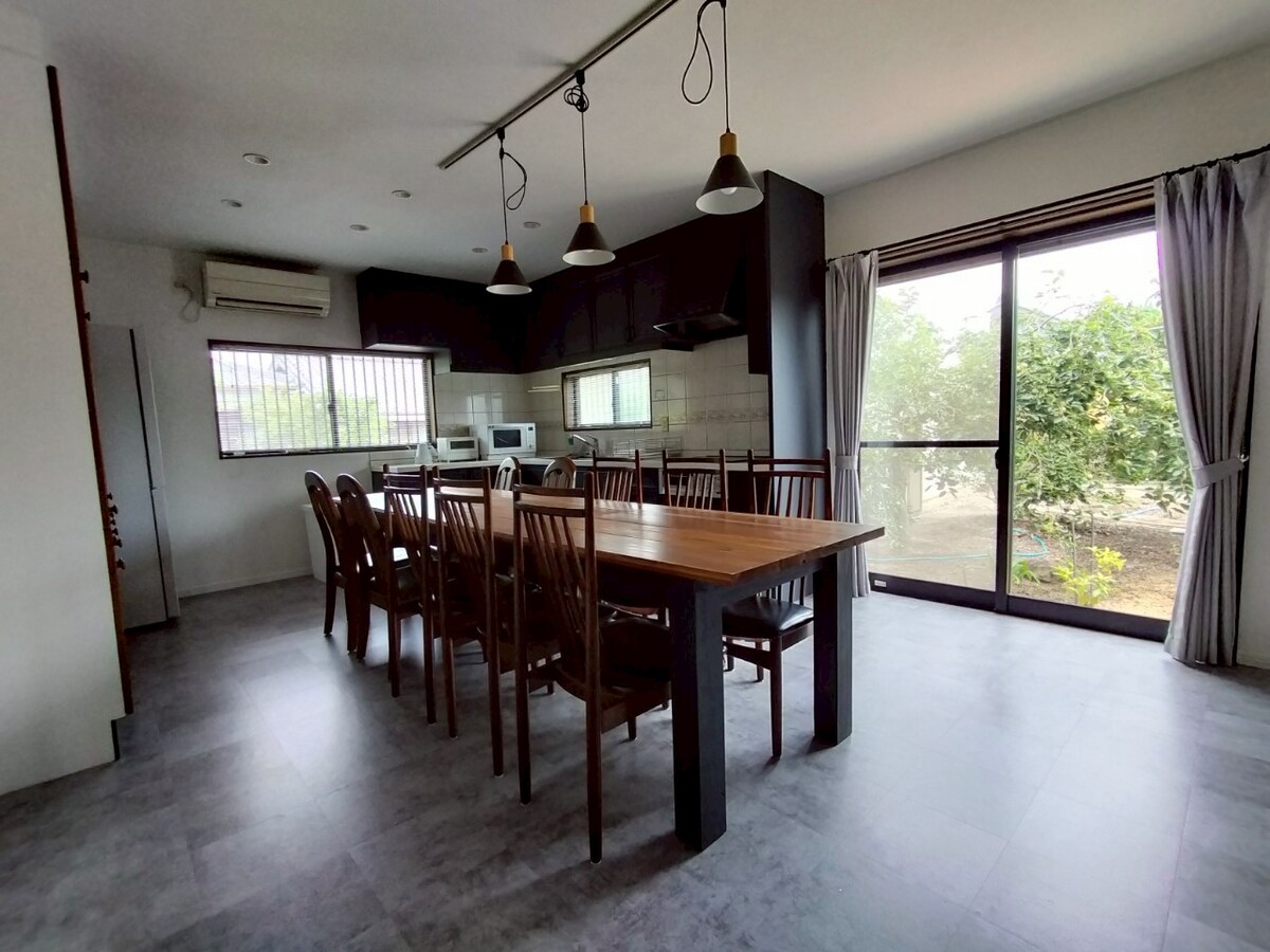 Hei! Privat hus på 107 kvm i Mihama, Wakayama. Passer for 4–5 gjester, opptil 12. Inkluderer et spisebord på tre meter, 65 tommers TV (strømming/YouTube), kjøkken og en hage på 800 kvm. Nyt sesongens fruktplukking, grill eller pizzaovn (be om på forhånd). Tilgang: JR Gobo stasjon (ni minutter med bil eller 18 minutter med buss) og parkering for 3–5 biler. En perfekt base for Koyasan (to timer) og Kumano Kodo – Takijiri Oji (1,5 time). Jeg er en sertifisert Kumano Kodo-guide og kan dele tips eller tilby guidede turer. Passer familier eller grupper som ønsker en landlig ferie.