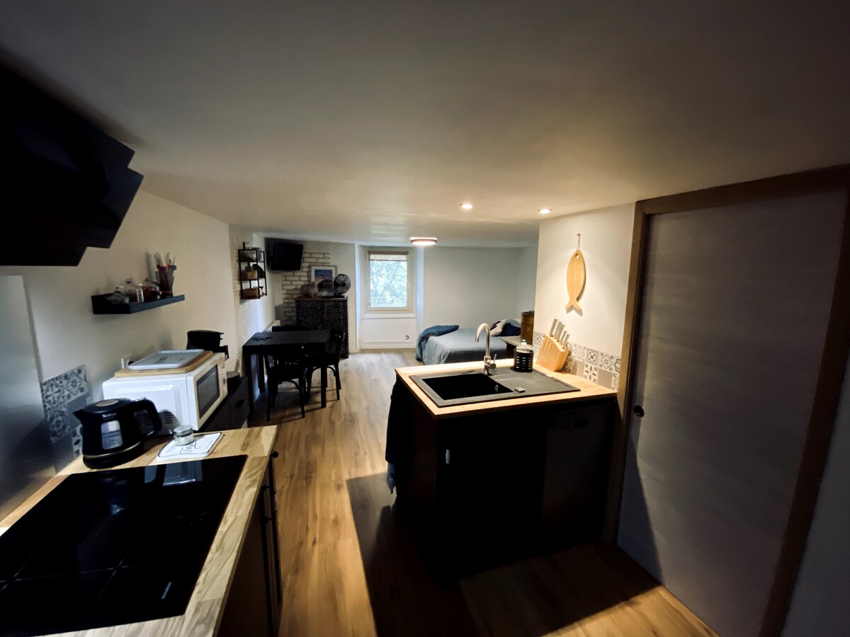 Oppusset studioleilighet med et areal på 38 kvm i første etasje! Utstyrt med alle fasiliteter! fullt utstyrt kjøkken, vaskemaskin, stekeovn, kjøleskap, mikrobølgeovn osv. Enda bedre er at overnattingen ligger i sentrum, 30 sekunder fra handlegaten «rue droite». Mange butikker innenfor to minutters gange! parkering er gratis fra kl. 19.00 til kl. 09.00 og på søndager og helligdager. Mindre enn fem minutters gange, en fin spasertur langs bredden av Tarn venter deg 😜.