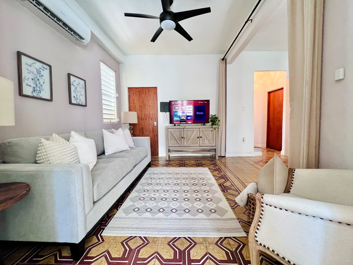 Velkommen til den sentralt beliggende leiligheten vår 💚 i San Juan! Det koselige og moderne stedet vårt ligger i det pulserende sentrum, og er perfekt for reisende som ønsker å fordype seg i den rike kulturen og spenningen i Puerto Ricos hovedstad. Tidligere hotell, nå leilighetsbolig. Selv om bygningen i seg selv ikke har blitt oppdatert nylig, har leiligheten et stilig oppholdsrom, et fullt utstyrt kjøkken, et koselig soverom og et rent, moderne bad. Nyt fasilitetene, som trådløst nettverk med høy hastighet, aircondition og smart-TV. Verten kan be om legitimasjon📸.