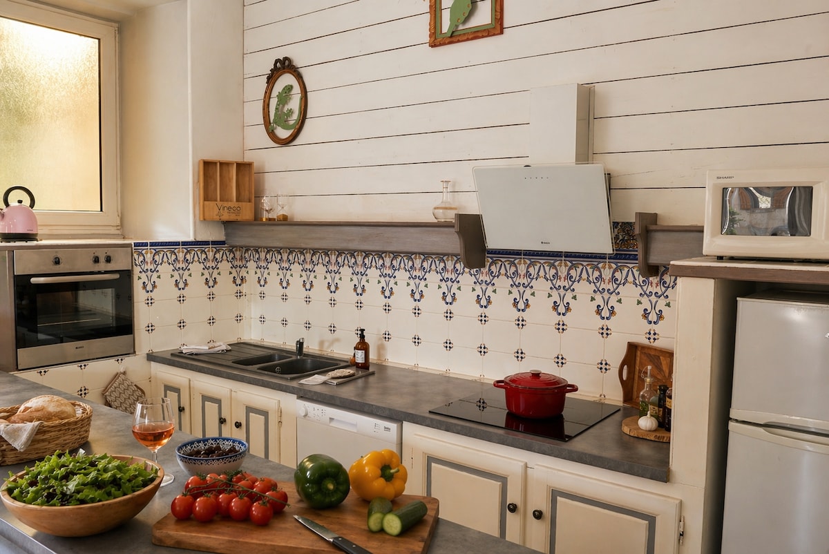 Kun for familieopphold. Stor T3 i 1. etasje, 5 min gange fra byen, lukket hage med trær på 3 ha, 2 soverom, 1 sovesofa, 1 bad med dusj, 1 kjøkken åpent mot 1 stue, lys stue, hagemøbler, grill, svømmebasseng, babyutstyr tilgjengelig (seng, badekar, stol...). Felles svømmebasseng for begge boligene. (Brukervilkår se slutten av annonsen "interne regler, / les mer, / tilleggsregler")