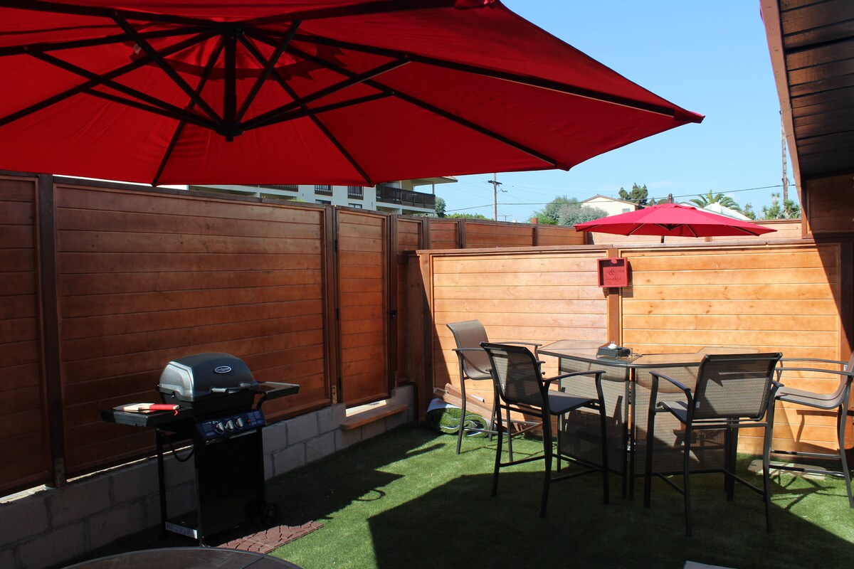 Perfekt for hjemmeferier, hjemmekontor, romantiske turer eller langvarige opphold (ukentlige og månedlige). Ingen fester, takk. Sjarmerende hytte med én seng og ett bad tilbyr komfort i feriestedstil for to gjester. Myk queen size-seng, et luksuriøst bad og fullt utstyrt kjøkken. Gå ut til din private gårdsplass og bakgård – komplett med bålplass, grill og utedusj. Inkluderer gratis gateparkering, sykler, en Pack 'n Play, boogiebrett, strandleker, kjøler og mer!