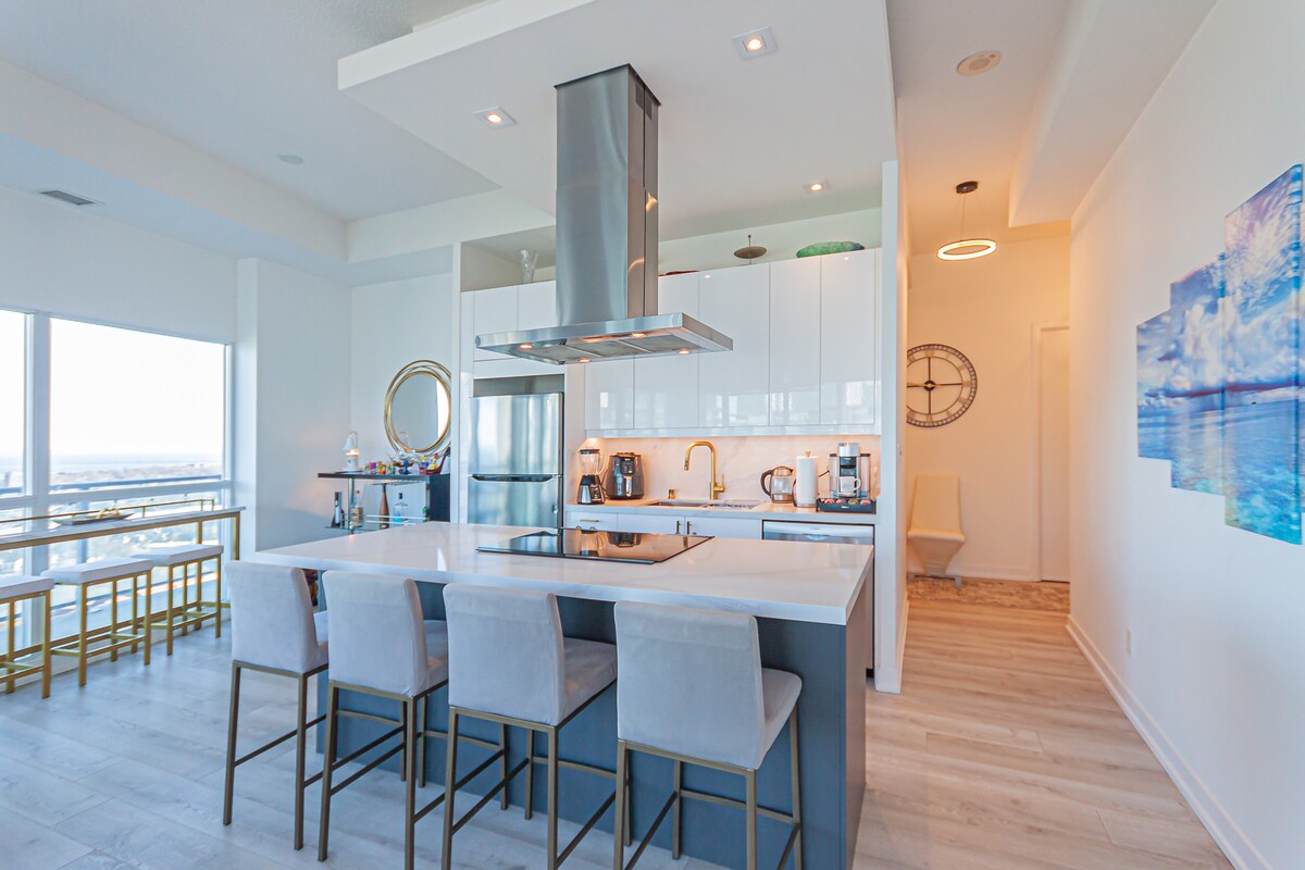 Velkommen til den moderne og luksuriøse hjørnetoppenthouseen vår! Dette lyse stedet er stilig designet med frodige planter og eksklusive detaljer, og tilbyr komfort, eleganse og en avslappet tropisk stemning. Nyt den fantastiske panoramautsikten over byen og slapp av med førsteklasses fasiliteter, inkludert et utendørs basseng, boblebad og badstue. Bare 15 minutter med bil til sentrum. Kollektivtransport ligger like utenfor døren. 10 minutter med bil til Rogers Stadium. Perfekt for kresne gjester som ønsker et opphold på et høyere nivå i Torontos pulserende urbane sentrum