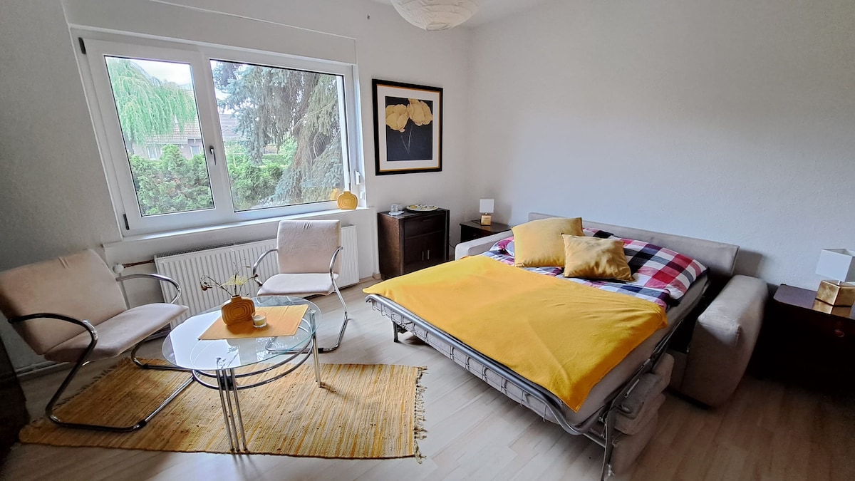 Koselig leilighet i første etasje i huset mitt i Berlin-Niederschönhausen med egen inngang og privat terrasse ved hagesiden. Leiligheten har ett soverom og en stue med uttrekkbar dobbeltseng og et fullt utstyrt tekjøkken med mikrobølgeovn, oppvaskmaskin, kjøleskap, en liten ovn og alle nødvendige redskaper. Stort, privat bad med dusj, badekar, vaskemaskin, tørketrommel. Maks kapasitet er 4 voksne, men anbefalt belegg er 3 voksne eller en familie med 2 barn.