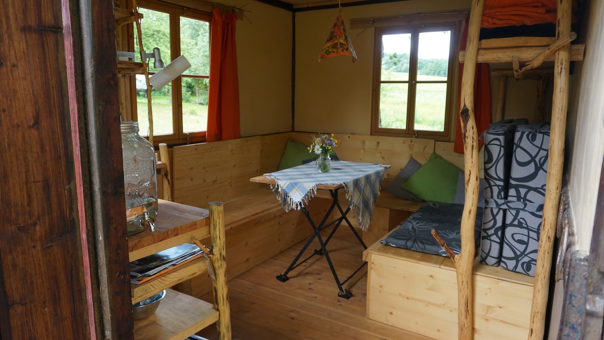 Her kan du slappe av midt i naturen, i et koselig trehus og la sjelen slappe av. Høydepunktet ved overnattingen min er badekaret i tre – boblebadet. På den omkringliggende engen kan du også slå opp teltet ditt!