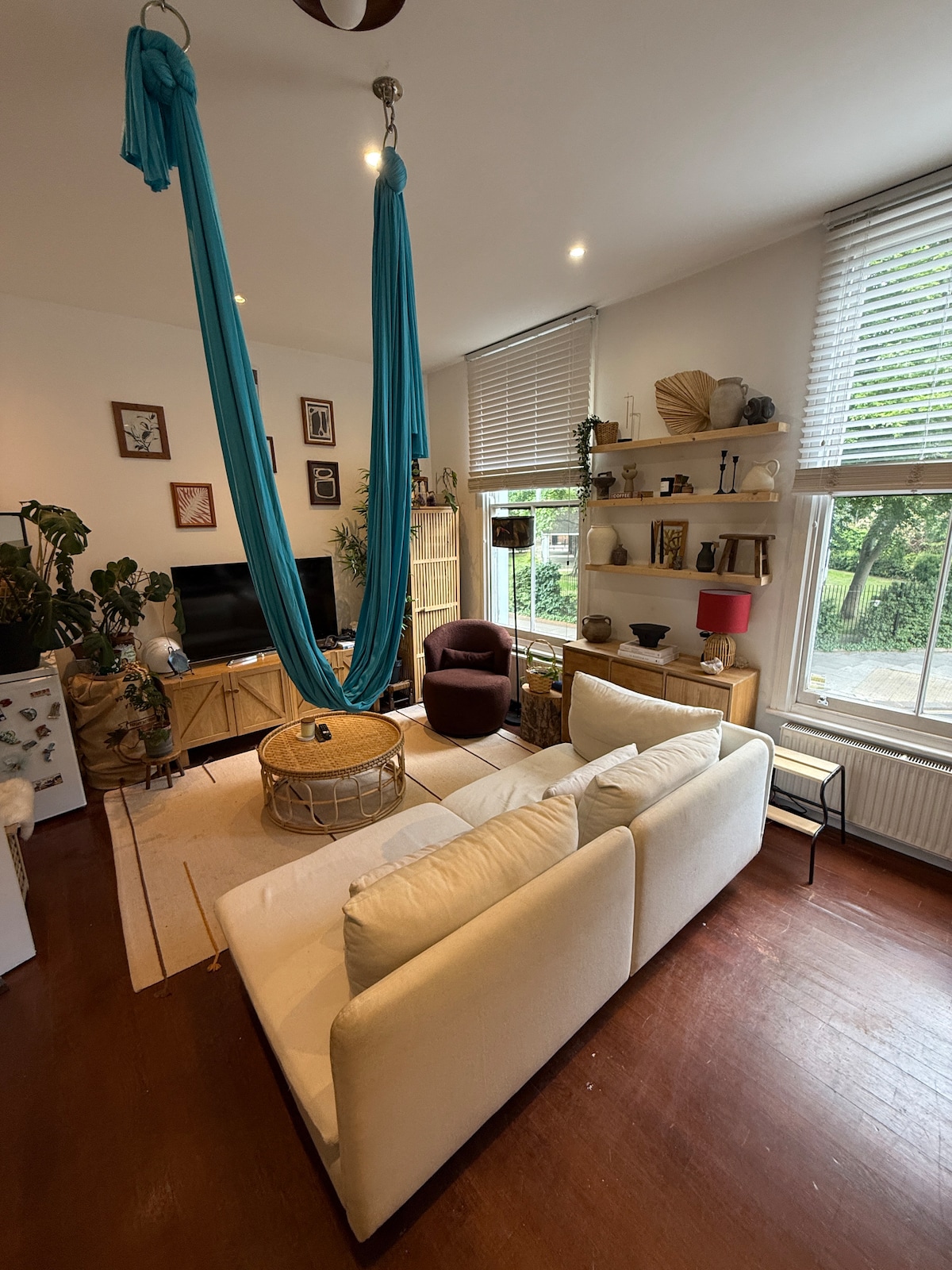 Våkn opp til fuglesang og slapp av i komfort – ideelt for å utforske London mens du føler deg som en lokalkjent i et rolig, elegant sted. Fredelig bohemsk leilighet med én seng bare fem minutter fra Hampstead Heath Park, Overground og Belsize Park Underground. Nyt et fullt utstyrt, separat kjøkken, en romslig balkong som er perfekt for avslapning, et yogaoppsett med hengekøye i taket og et koselig badekar. Plassert i et rolig, grønt nabolag omgitt av butikker og kafeer. 20 minutter til Oxford Street, Tottenham Court Road, Euston.