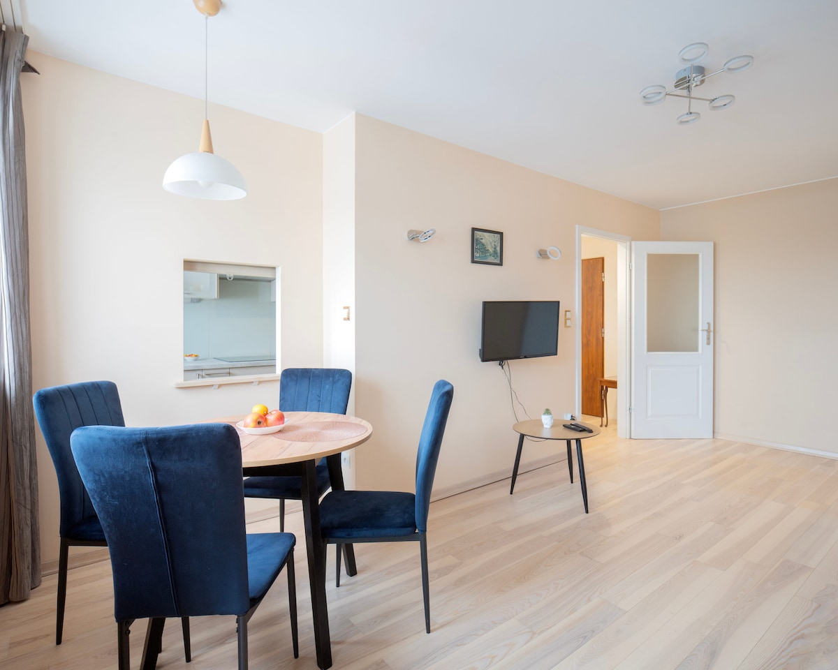 Fullt utstyrt for korte og lange opphold. For én til seks gjester. Leiligheten vår ligger syv minutter med tog fra sentrum, og den er full av naturlige elementer, perfekt for å gi deg en fredelig reise. Fra den store balkongen vår kan du observere hele Warszawas skyline. I første etasje er det et supermarked som er åpent kl. 06.00–22.00. Det private kvartalet Soho Factory gir deg naturen i nærheten av sentrum. 🎨 I nærheten: Soho Art Gallery, Universitetet SWPS, Wedel Chocolate Museum, National Stadium, Koneser Vodka Museum …
