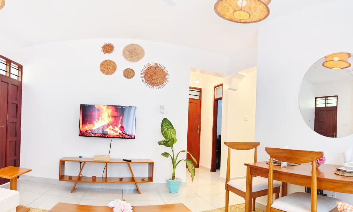 Der luksus møter havet! Bare fem minutter til strendene. Denne leiligheten med eget bad tilbyr ferieeleganse med hjemmekos. Gangavstand til stranden og de beste kjøpesentrene Evighetsbasseng på taket og underholdningslounge. Komplett utstyrt treningsstudio Trådløst nettverk med høy hastighet Ukentlig rengjøring Sikker tilgang døgnet rundt Perfekt for par og familier (maks 4). Nyt Uber/Glovo-levering, gå til City Mall og slapp av i paradis. Fasiliteter i feriestedstil, hjemmekoselig privatliv. Bestill ferien din til Nyali nå!