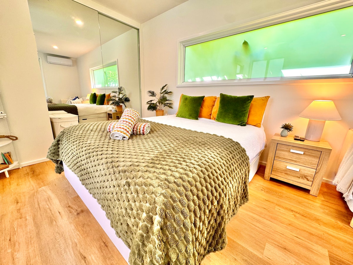 Light & airy 1 bedroom garden flat with seperate entrance. Just built with soaring ceilings, exposed beams & polished concrete floors . There is a loft space in the bedroom for you to explore. A great spot to read a book or take a nap. There is a separate lounge/ kitchen with glass sliding doors that lead onto a deck with views of the garden. The deck is north facing & sun drenched. You have your own full kitchen and a combined bathroom laundry. For comfort you have ceiling fans & A/c.