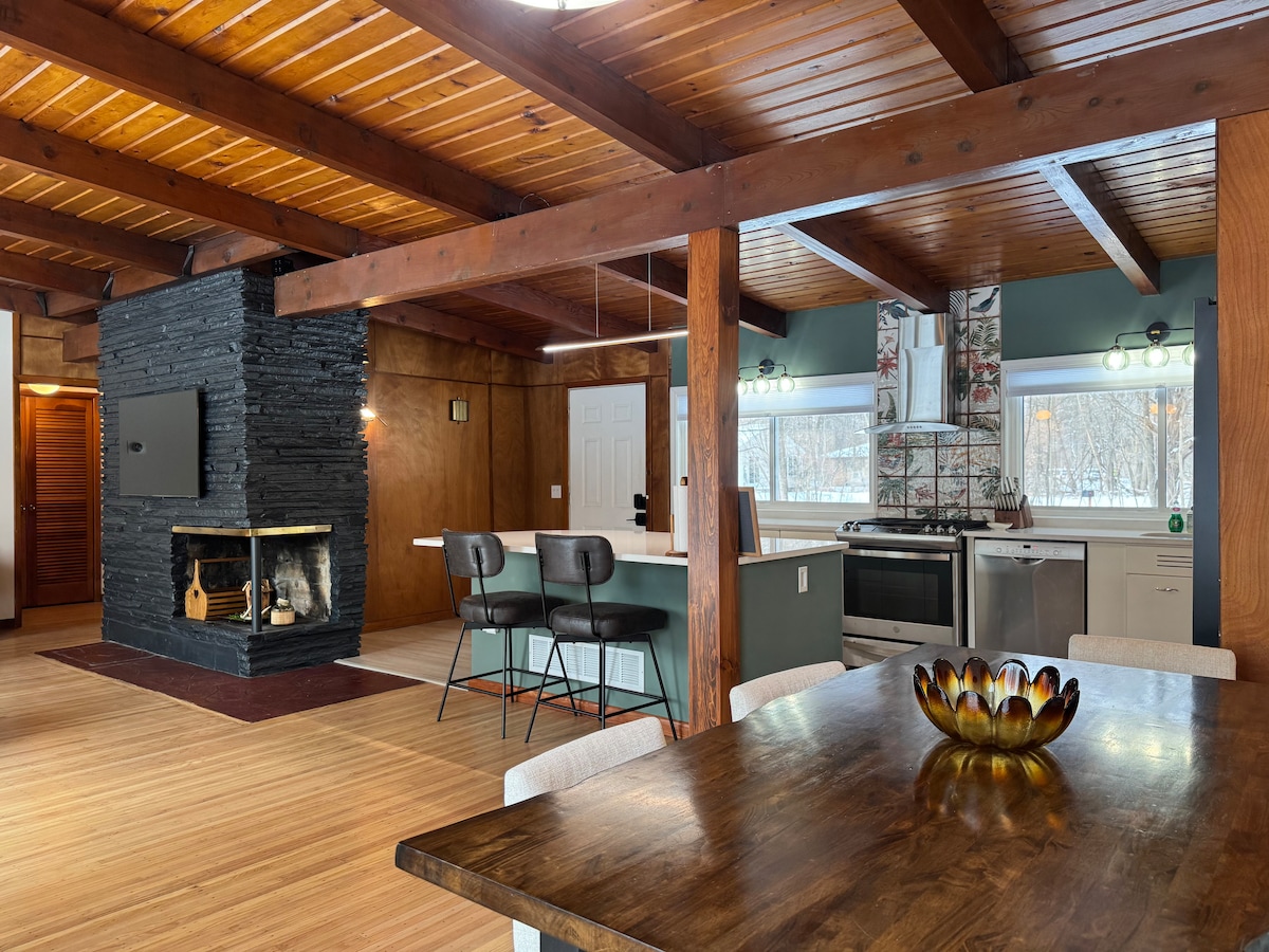 75' Lakefront | 6 utendørs soner | Wellness Nook Slapp av på True North, et fristed på 232 kvm med seks utesteder (fire terrasser/to dekk). ✔ Vert: tilpasset drikkebar med 50 lb ismaskin og vinkjøleskap (ta med egen drikke). Nyt granittkjøkkenet og vedfyrt pizzaovn. ✔ Velvære: CLIMBR-treningsstudio med utsikt over innsjøen, kano/redningsvester og tilgang til sandstrand (0,1 mi). ✔ Tilfluktssted: to master-suiter med private balkonger. Se havørner og svaner fra bålplassen. Eksklusiv komfort for åtte!