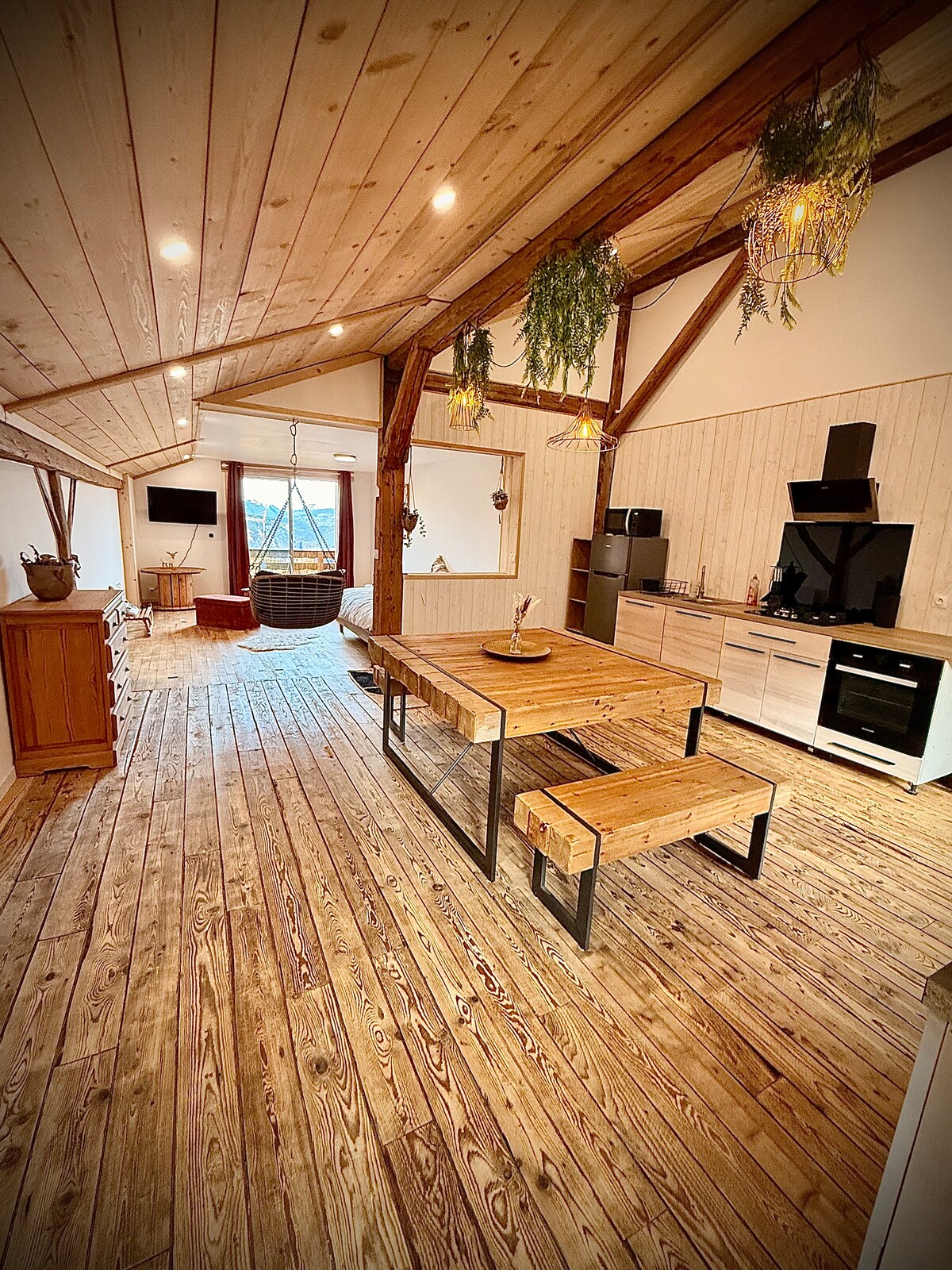 Velkommen til din fjellkokong, et varmt loft høyt oppe, som tilbyr deg en fantastisk utsikt over fjelltoppene, ideelt for å nyte en kaffe ved soloppgang eller et glass vin på slutten av dagen. Loftet har et lyst oppholdsrom, et fullt utstyrt kjøkken og et komfortabelt soveområde designet for avslapning. Etter en dag med fotturer eller skiturer kan du sitte i stuen for å nyte utsikten og lade opp batteriene. Mulighet for å legge til en barneseng.