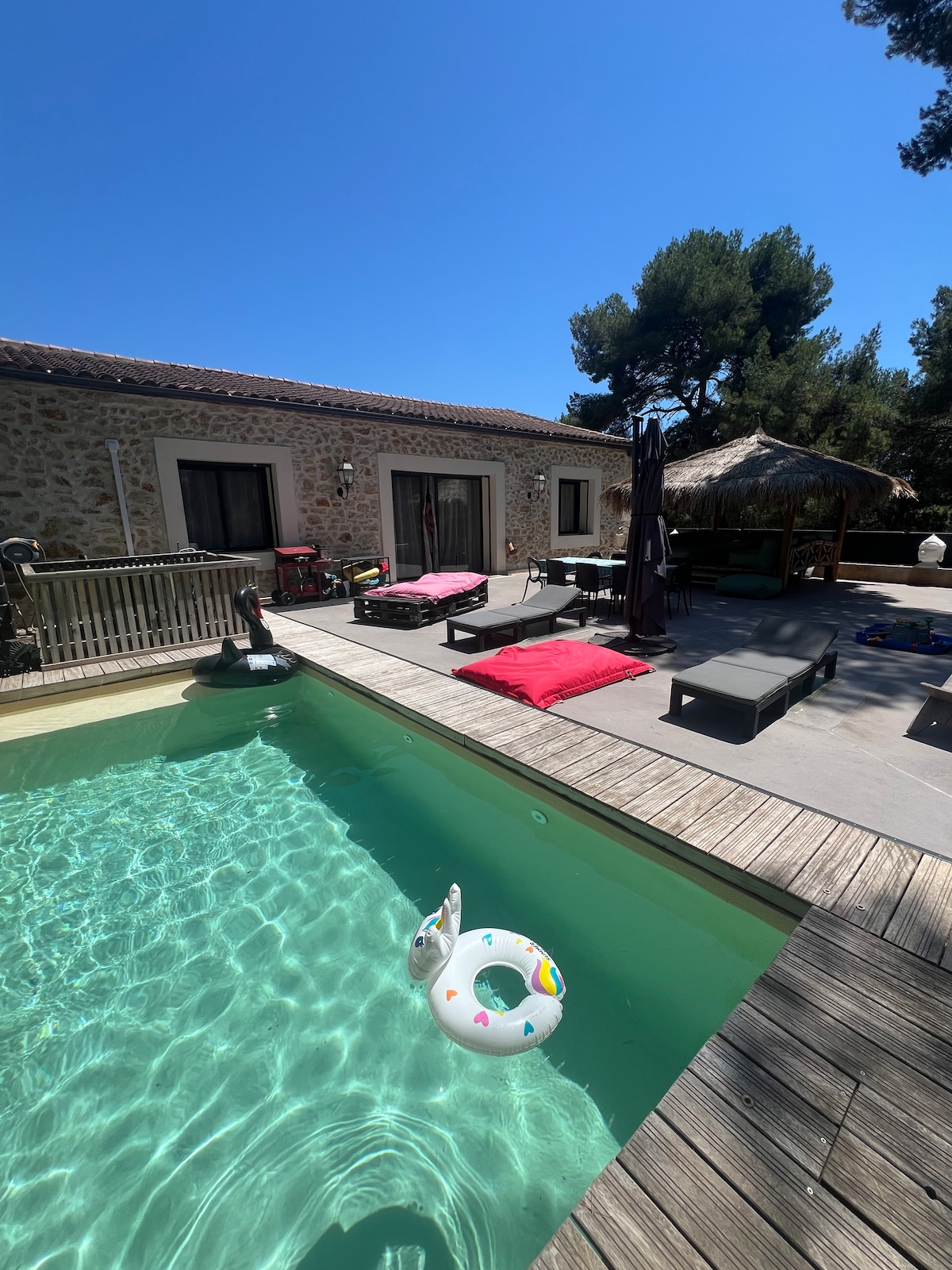 Maison neuve, climatisée/chauffée avec: • Jardin privé de 500m² • Terrasse privée de 60m² (100m² allée incluse) • Jacuzzi privé, disponible 24h/24 & chauffé • Grand parking gratuit et sur place • Située à seulement 10min des plages, 5min du centre ville, des centres commerciaux et des autoroutes A75 et A9. • Jeux de société pour passer de bons moments en famille ou entre amis Idéale pour un séjour paisible à la campagne, tout en étant très proche des lieux emblématiques de Béziers.