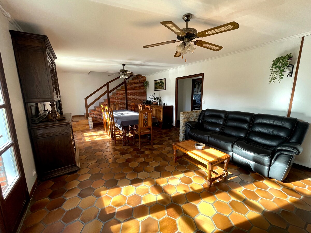 Ha det gøy med familie eller venner i dette varme og innbydende rommet for opptil 8 personer. Du vil ha huset for deg selv, det ligger på en stor tomt med plass til å parkere bilene dine. I første etasje er det en stor inngang med en sovesofa, og i andre etasje finner du et kjøkken, et bad, et separat toalett, et soverom med en kingsize-seng og TV, en stue med peis for kvelder ved peisen, 2 sovesofaer, en stor TV og en spisestue.