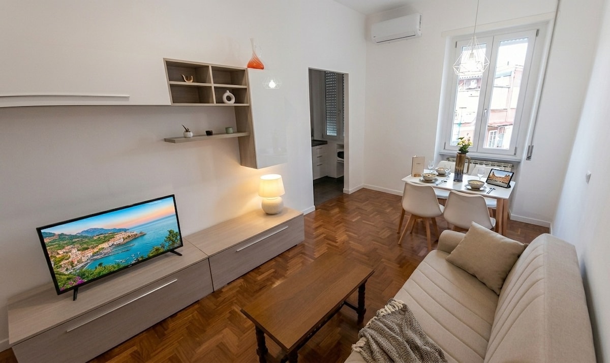Cozy 85 sqm apartment in Talenti, Rome north-east, in a quiet residential area, not central but well connected by public transport. 1 min walk to bus terminal, metro B 10 min by bus. Recently renovated with 3 bedrooms, 2 bathrooms, kitchen, 7 beds, A/C in all rooms, mosquito nets, free Wi-Fi, 50" smart TV. On 3rd floor, no elevator. Building exterior needs renovation, interior is modern and comfortable.