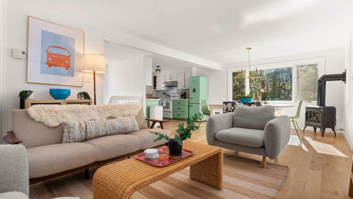 Opplev totalt privatliv i dette vakre mid-century-hjemmet med fire soverom ved Long Bow Lake. Den koselige spisestuen har stilige tregulv og moderne design, og den har en gasspeis. Dette familievennlige feriestedet tilbyr eksklusiv utsikt over innsjøen, komplett med en brygge og fire kajakker for endeløse eventyr! Nyt rolige øyeblikk på den skjermede verandaen, fyr opp Weber-grillen eller utfordre hverandre til bordtennis. Bare 15 minutter fra Lee sentrum, nær utsalgssteder, turstier og Otis Ridge-ski!