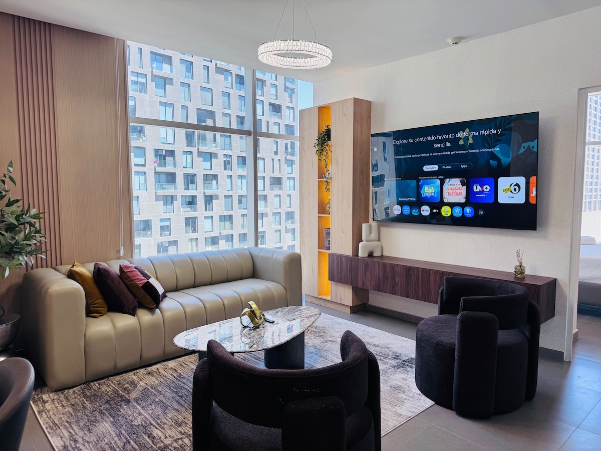 Velkommen til Distrito Armida! Bo på Torre Acacia, et av de mest luksuriøse Airbnb-utleiestedene våre i San Pedro. Loft med dobbeltseng og dobbeltsovesofa, ideelt for tre personer, med en privilegert utsikt. Den har 100 Mbps trådløst nettverk, smart-TV, varm/kald klimakontroll og privat parkering. Bygningen tilbyr sikkerhet døgnet rundt, basseng og en uslåelig beliggenhet, bare noen skritt fra Fashion Drive og Hospital Ángeles Valle Oriente.