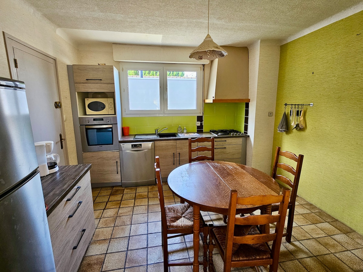 Rekkehus i tre etasjer, ideelt for grupper, familier eller forretningsreisende. Det mest komfortable: Reis lett, sengene er redt før ankomsten din! 🏠 Overnattingsstedet (opptil 6 personer) Tre private soverom: inkludert en hovedsøvnromssuite. Fullt utstyrt, åpent kjøkken til måltidene dine, med utsikt over en stue med TV og trådløst nettverk med høy hastighet. Et spillrom med bordfotball samt en liten uteplass. Parkeringsplasser i nærheten, inkludert én rett bak huset.