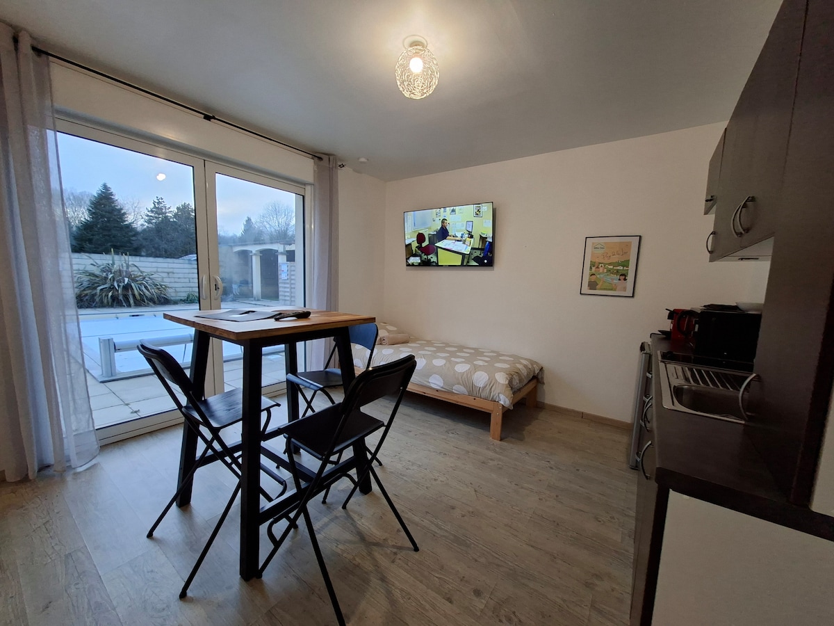 Studioleilighet på 30 kvm, vendt mot naturen med terrasse og gårdsplass. Hagen og bassenget deles med oss. En stue med dobbeltseng, garderobe, TV, møblert og utstyrt kjøkken, to bål, mikrobølgeovn, kaffetrakter, vannkoker og kjøleskap. Et baderom med dusj og WC. VALGFRITT Spa for fem personer, inkludert to solsenger og tre seter med massasje og jacuzzi 40 euro/dag. Frokost og måltider på forespørsel 10–20 euro. Kjæledyrpassing eller utflukt under fraværet ditt om nødvendig 15–20 euro.