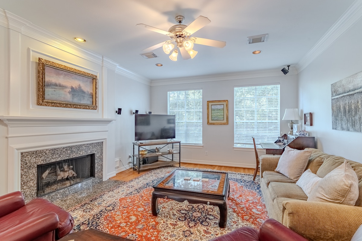 BELIGGENHET! BELIGGENHET! *Vurdert blant de 5 % beste hjemmene på Airbnb* Sjelden oppdagelse! Beliggende i en rolig og trygg gate med trær midt i byen. Gå til fine spisesteder, butikker, treningsstudio, bokhandel og dagligvarebutikker. Mindre enn 5 miles fra sportsstadioner, Medical Center, Downtown og The Galleria! *RASKT 300 mbps TRÅDLØST NETTVERK* 3300 kvm luksusliv m/ en rolig og rolig atmosfære. Fire soverom, 3,5 bad, vaskemaskin/tørketrommel, boblebad. Garderobe med tre stasjoner for hår og sminke. Privat terrasse med avslappende fontene.