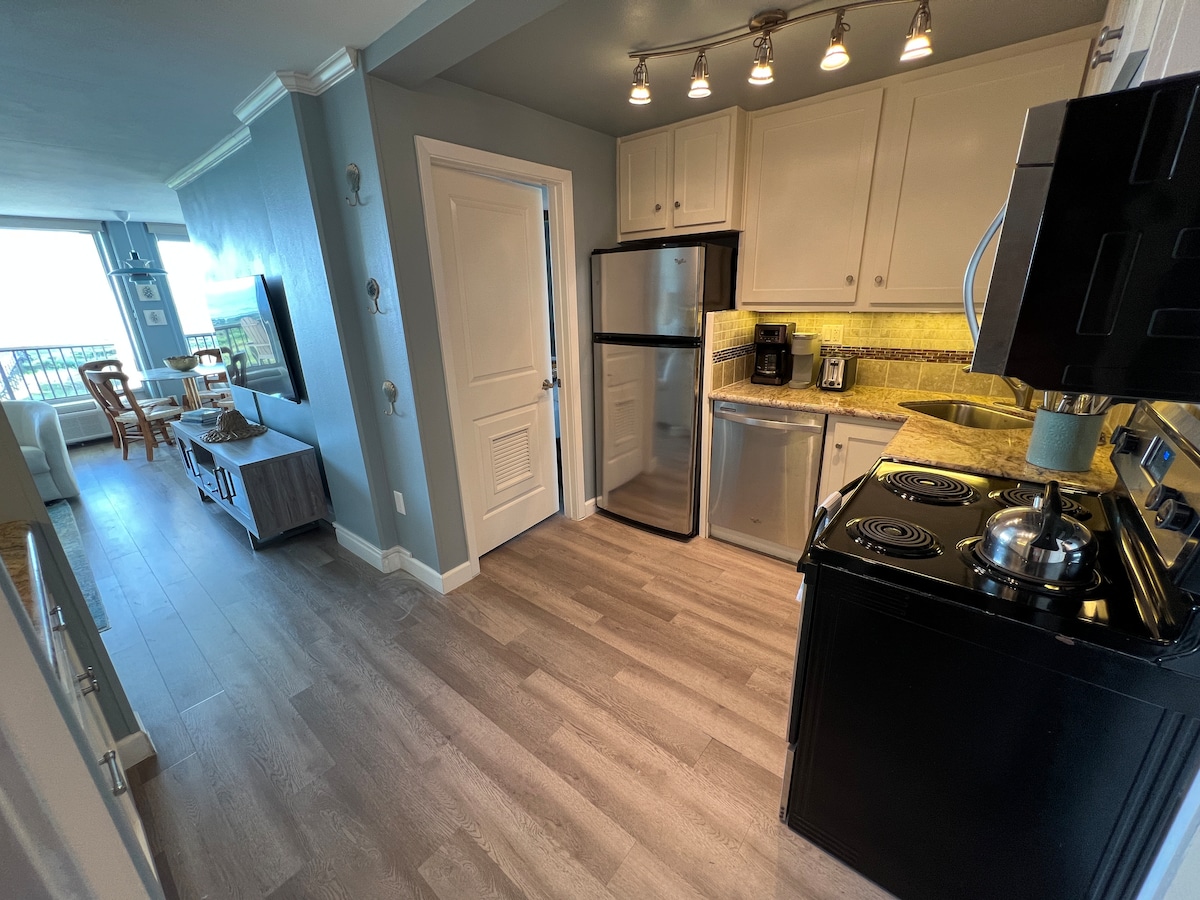 Hvis du ser etter en drømmeutleie på stranden, er dette stedet for deg! Gå inn i denne fredelige leiligheten og kjenn stresset smelte bort! Du kan ikke unngå å føle deg rolig av den naturlige skjønnheten i havet, soloppgangen og måneoppgangen fra sengen din. Nyt en avslappende kveld på balkongen og lytt til bølgeskvulp og sjøfugler mens havbrisen virvler rundt deg. Inne i leiligheten er det like nydelig, i beroligende nyanser av blått og hvitt. Du kommer til å elske de luksuriøse møblene og apparatene!