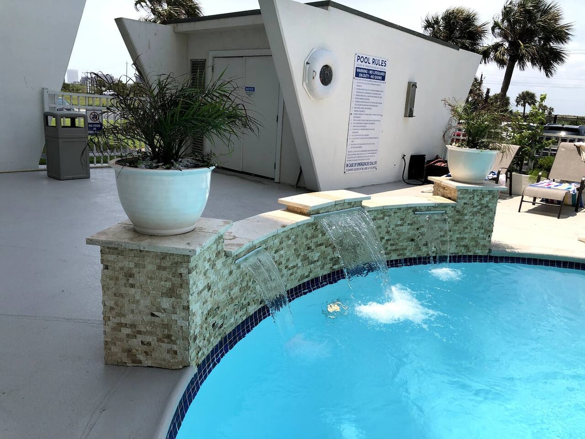 Sentralt plassert, denne lille perlen ligger ett kvartal fra Mardi Gras-paraderuten, ca. 3 minutter til stranden, nær Pleasure Pier og cruiseskip, barer, arenaer, restauranter og UTMB! ~ Overbygde uteområder med grill, bålplass og utendørs huske, perfekt for å slappe av om kvelden. Denne to-sengs, ett-bad har komfortabelt plass til seks personer: én queensize-seng, én seng i full størrelse og én queensize-sovesofa.