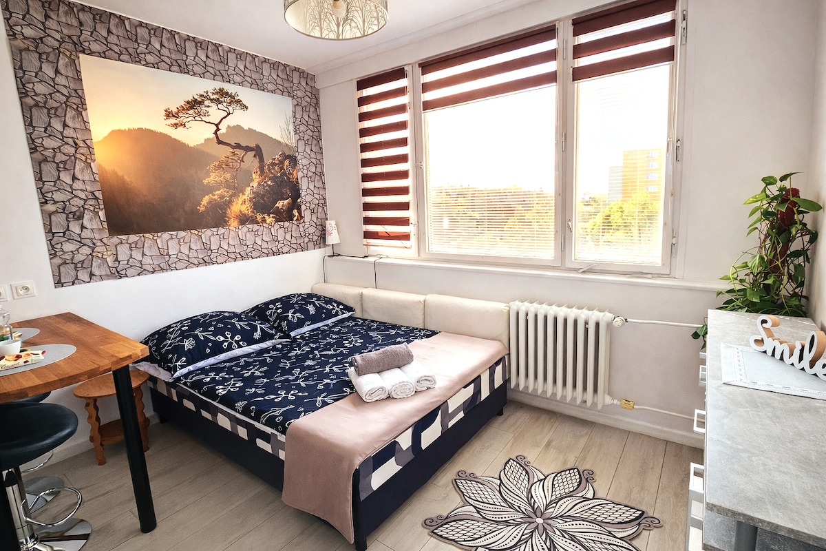 Luksuriøs og moderne leilighet i SKY PARK-PROSJEKTET (prosjekt av en verdensberømt arkitekt Zaha Hadid) i det nye sentrum med en vakker utsikt over slottet og byen. Leiligheten ligger i nærheten av det nyeste kjøpesenteret Niva, 5 minutter fra Donau (Eurovea kjøpesenter) med mange kafeer og restauranter, og sentrum (gamlebyen) ligger 5-10 minutters gange unna. PARKERING UTEN EKSTRA KOSTNAD I BYGNINGEN INKLUDERT