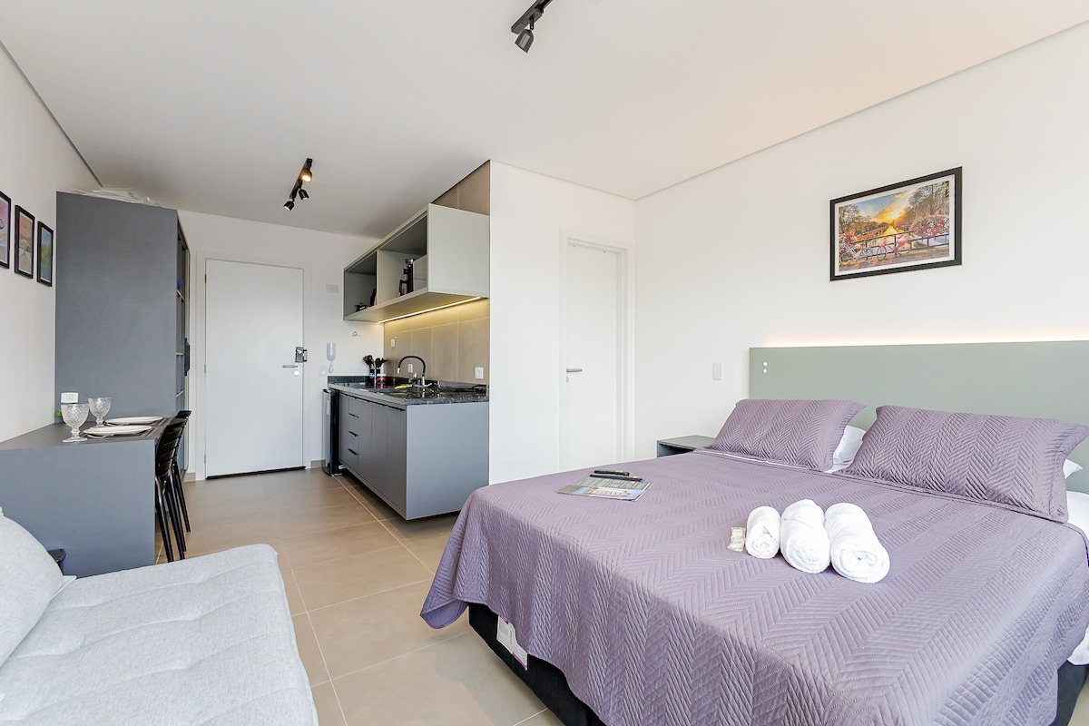 Moderne studioleilighet i bysentrum – ideell for dem som ønsker seg komfort, praktisk innredning og en utmerket beliggenhet i Curitiba. Miljø med klimaanlegg, utstyrt kjøkken og smart-TV – perfekt for fritid eller arbeid. 🛏️ Det er komfortabelt plass til opptil fire personer, sengetøy av god kvalitet. • Oppvarmet basseng. • Treningsrom • badstue • Terrasse • klesvask (betalt) 🚗 Parkering tilgjengelig i bygningen, 35 BRL per natt. Betaling via PIX til verten.