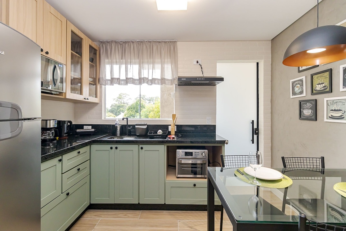 Moderne og innredet, med utsikt over sentrum av Curitiba, parkeringsplass inkludert, fem minutter fra busstasjonen og 500 meter fra Shopping Estação. Den har plass til opptil fire personer med god komfort, komplett sengetøy, en queen size-seng og en dobbeltseng i sovesofa, klimaanlegg, gassdusj, smart-TV og mørkleggingsgardiner for hvilen din. Utstyrt kjøkken: elektronikk og førsteklasses servise. Døgnåpen concierge og elektronisk lås for innsjekking uten vert. Den har også et svømmebasseng, treningssenter, arbeidsområde og en døgnåpen dagligvarebutikk.