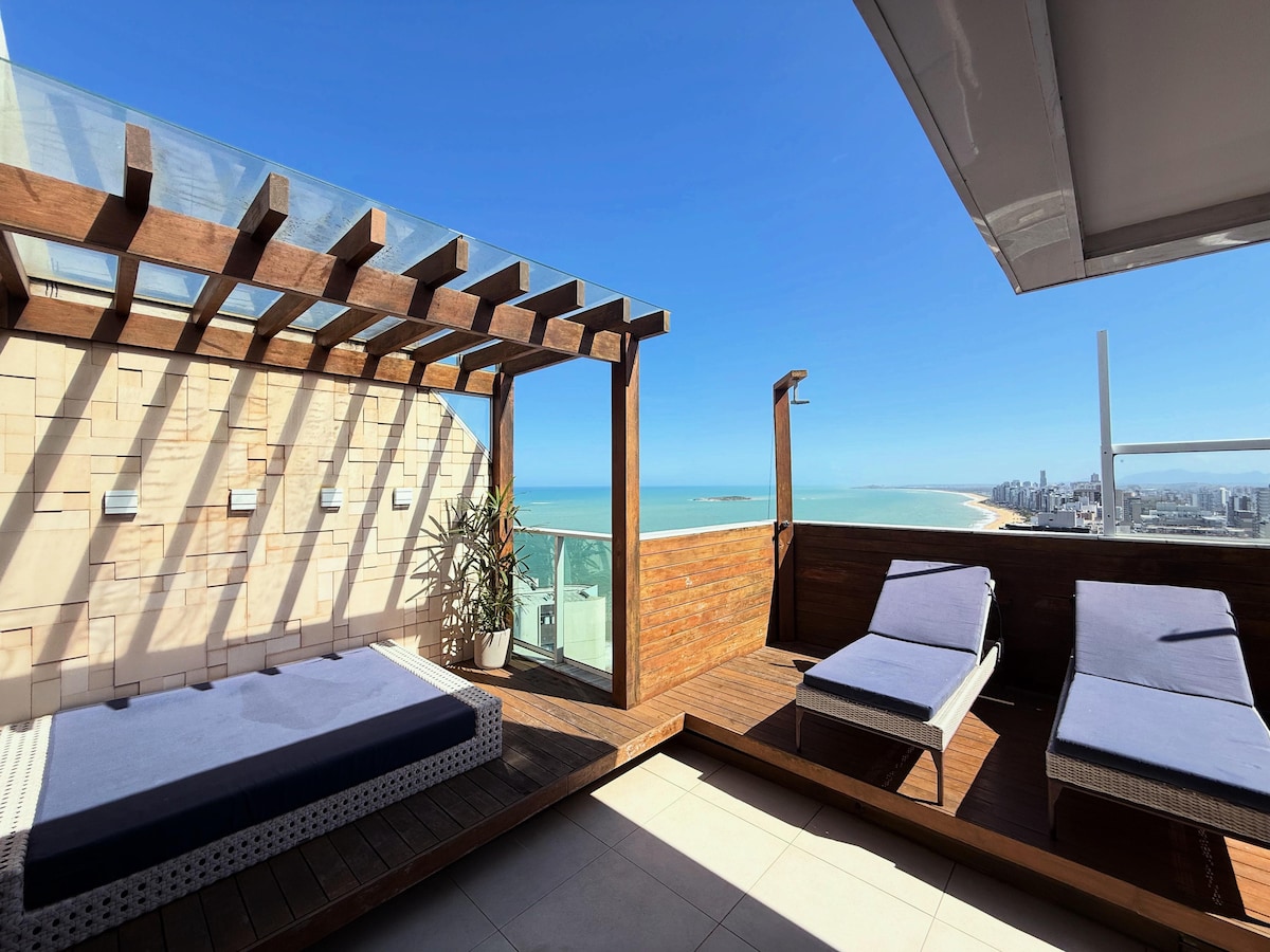 Takterrasse med boblebad og utsikt over havet med soltak. Svært romslig (65 m2). Beste punktet på Praia da Costa, den beste stranden i Vila Velha! Fullt utstyrt kjøkken med diverse utstyr til bar, cocktail og fine glass. Komfortabel og koselig suite med klimaanlegg. Rett og slett den beste opplevelsen av overnatting i Vila Velha! Oppholdet ditt her vil være perfekt! BARE KOM !!!
