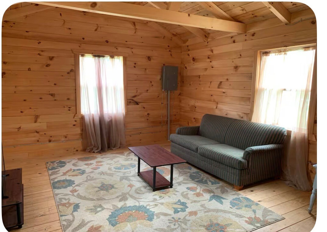 Kom og nyt denne splitter nye hytta i private skogsområder. Sitt på verandasvingen eller slapp av ved peisen. Nyt boblebadet for to og ny, stilig innredning med svart metallrekkverk mot en bakgrunn av det fineste håndverket innen trearbeid. Denne hytta ble bygget av lokale Amish- og Mennonittbyggere. Det er en dobbel hvilestol og en queen size uttrekkbar sofa med en minneskummadrass. Vi tilbyr snacks, brus, kaffe, te, frokostblanding, juice, pannkakeblanding og lønnesirup!