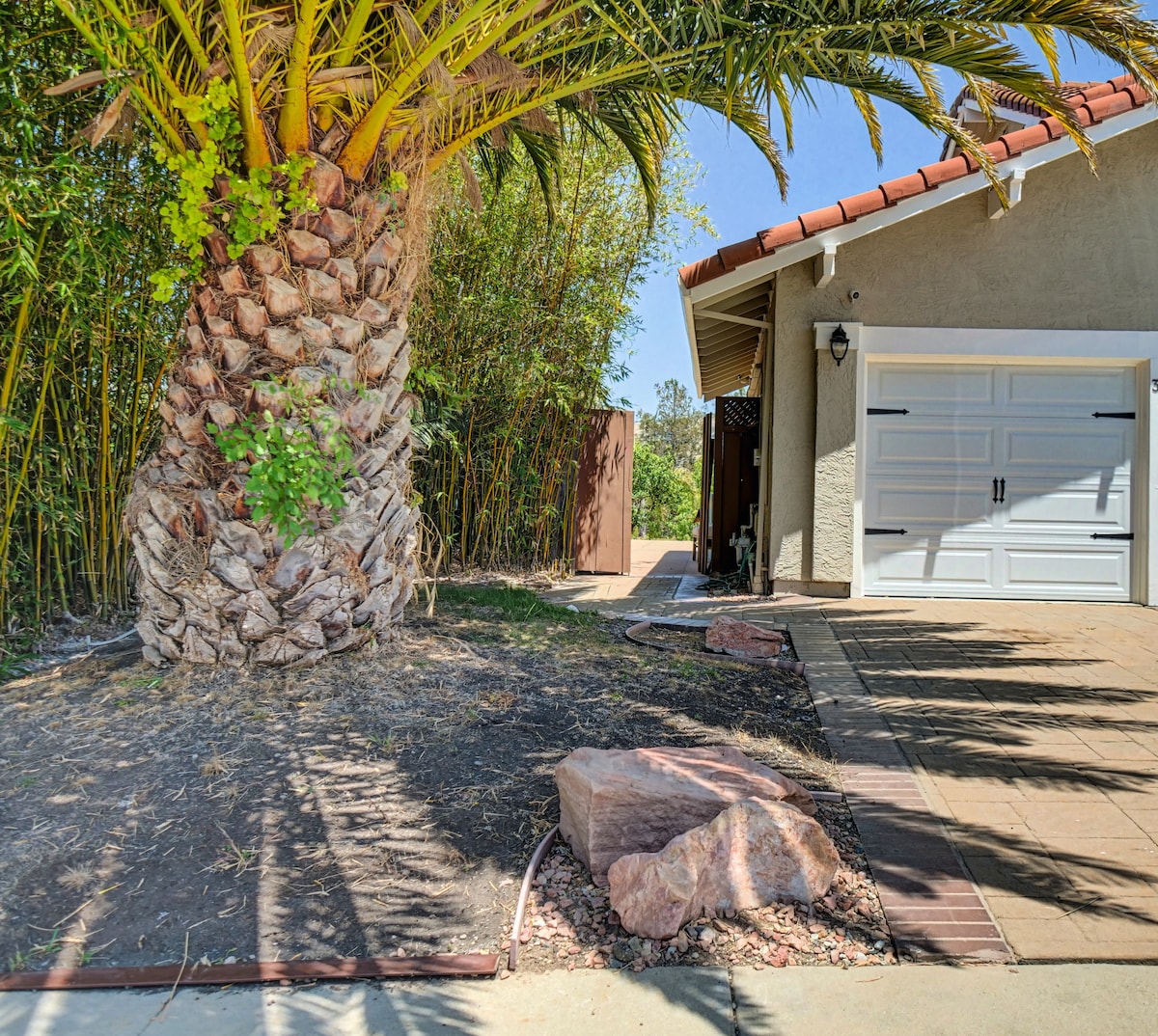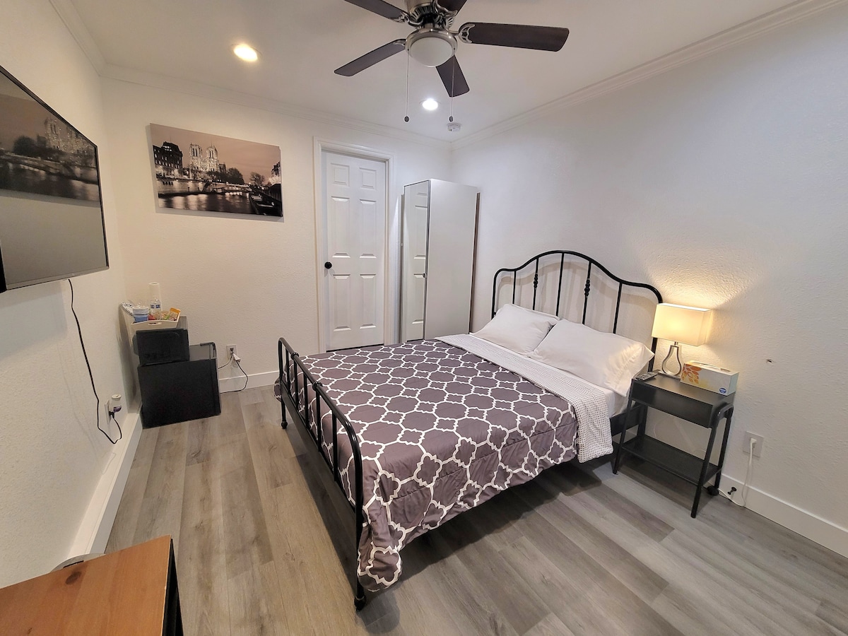 Reis til dette frittstående ADU, privat inngang, trygt, fredelig nabolag! Perfekt for arbeid, avslapning eller en miniferie. Nyt fantastisk utsikt, rolige landskap og naturlig lys. Kos deg i den komfortable dobbeltsengen eller slapp av i de myke hvilestolene. Tekjøkkenet har kjøleskap, mikrobølgeovn og valgfri induksjonskomfyr. Ekstra barneseng 20 USD/natt for en tredje gjest. Barn er velkomne! Spill basketball eller pickleball, nyt gratis gateparkering og slapp av i dette fredelige tilfluktsstedet. INGEN TILGANG TIL BASSENG.