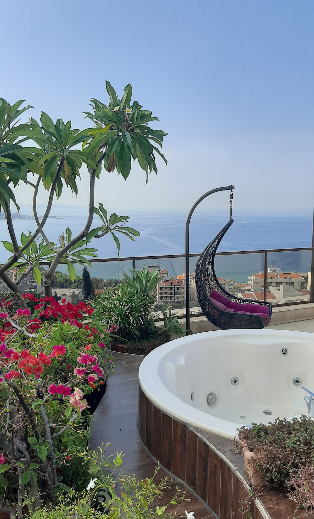 Denne romantiske loftsleiligheten på taket har døgnåpen strømforsyning. Det er et åpent, moderne sted med en stor terrasse med fantastisk utsikt over havet og fjellet. Terrassen har en stor rund jacuzzi hvorfra du kan nyte en fantastisk solnedgang. Praktisk plassert mellom Beirut og Byblos, har du enkel tilgang til de viktigste turistattraksjonene, og unngår bryet med Beirut. Du vil nyte en biljard, trådløst nettverk, smart-TV, klimaanlegg ...en opplevelse du ikke vil glemme